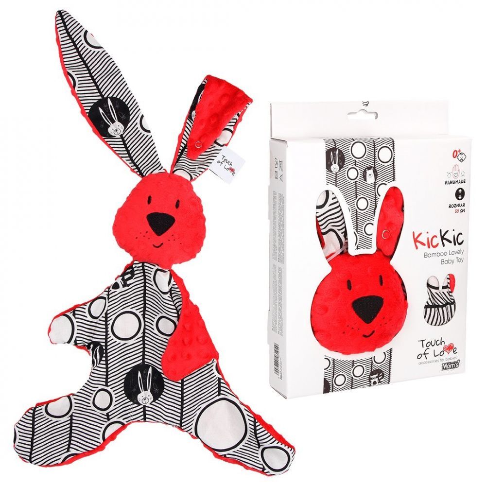Królik KicKic Mom’s Care to produkt należący do serii bambusowy dotyk. Może on służyć jako otulacz, kocyk, maskotka oraz zabawka. Jedna strona króliczka to miękka tkanina typu Minky, a druga to muślinowo-bambusowy materiał. Do najważniejszych zalet bambusowego materiału należy pochłanianie wilgoci, lekkość, miękkość. Tkanina jest „oddychająca” oraz hipoalergiczna – jest bezpieczna dla dziecka od pierwszego dnia życia.