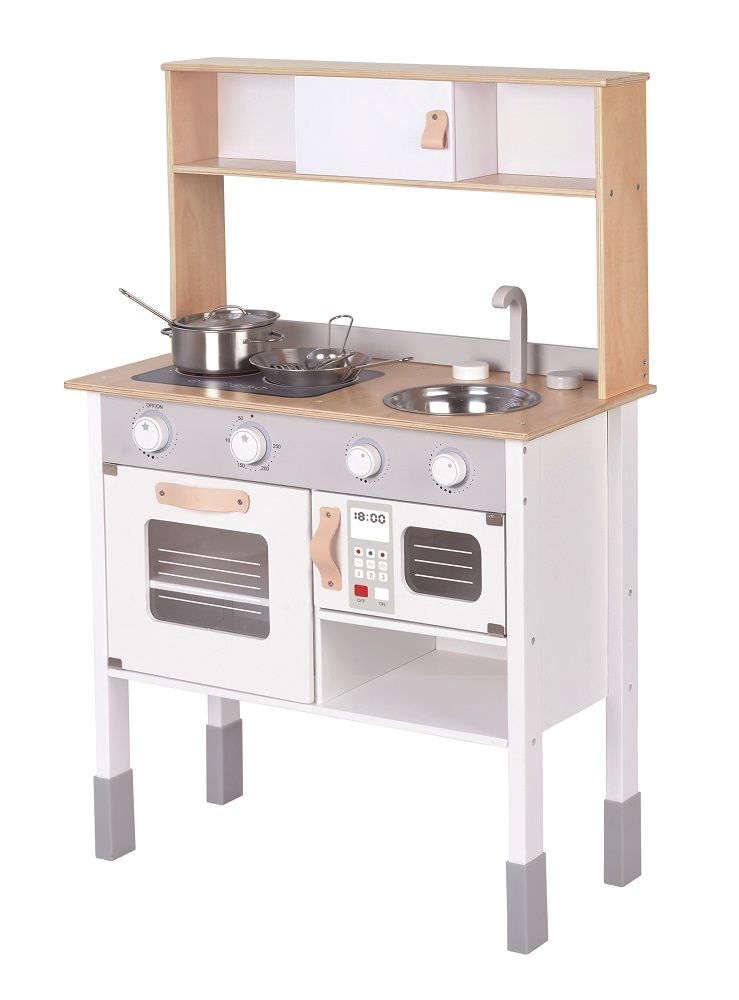 Kuchnię wykonano z dbałością o szczegóły, do zabawy zachęca piękne, gustowne wykończenie. Całość bardzo przypomina prawdziwą kuchnię. Podczas zabawy w kucharza maluch doskonali swoją koordynację, rozwija wyobraźnię oraz, w przypadku zabawy w grupie, trenuje umiejętności społeczne. Produkt wykonany jest z drewna – jest trwały i ekologiczny.
