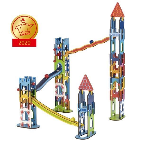 Kulodrom kolorowy zamek Goki to zestaw, który pozwoli zbudować bajeczny tor wyścigowy dla kulek. To, jak tor będzie wyglądał, zależy od pomysłu dziecka! Budowa toru może być doskonałym wstępem do nauki o grawitacji, taka aktywność rozwija również zdolność do logicznego myślenia oraz kształtuje zdolności manualne. W zestawie znajduje się 79 elementów: Elementy są ekologiczne – wykonano je ze sklejki. Łatwo się je montuje, są bardzo stabilne i nie rozłączają się podczas zabawy. Bajeczne kolory oraz elementy takie jak długie zjazdy, dzwoneczek itp. urozmaicą zabawę.