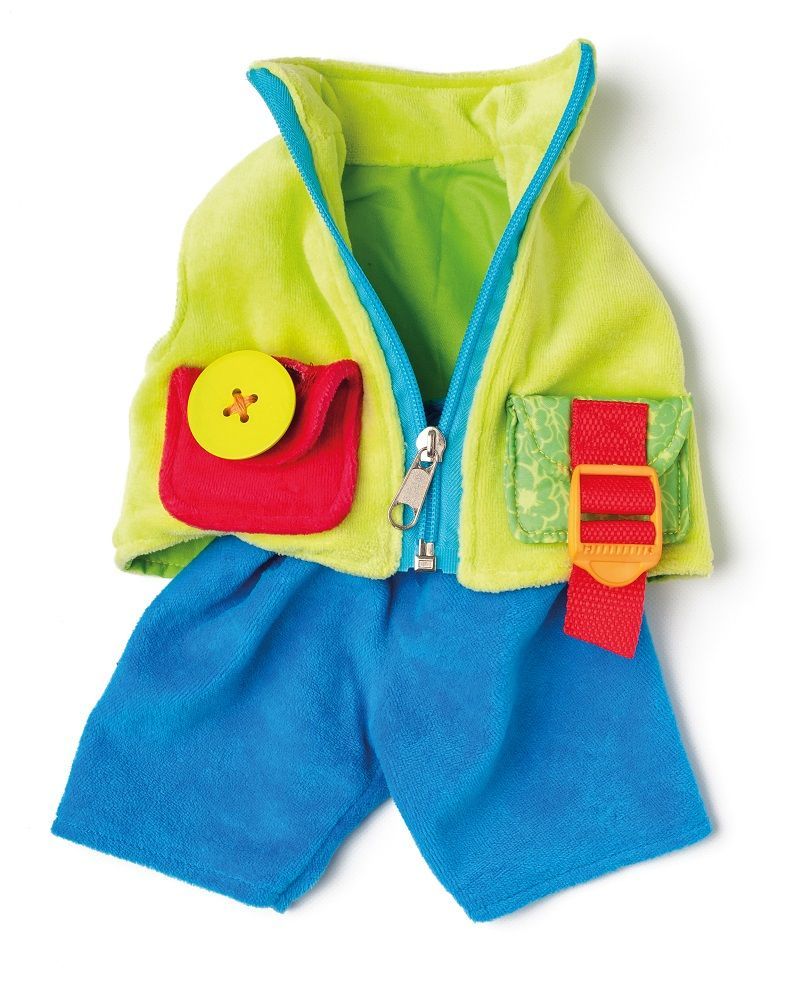 Lalka sensoryczna z zapięciami Krystian to wyjątkowa zabawka, która może stać się jednocześnie miłą przytulanką oraz narzędziem do ćwiczenia paluszków i nauki samodzielnego ubierania. Ubrano lalki wykonano z dbałością o szczegóły: daszek czapeczki można opuszczać i podnosić, kamizelkę zapina się na zamek błyskawiczny, kieszonki kamizelki są zapinane – jedna na pasek, a druga na zamek, koszulka pod spodem zapinana jest na rzep z tyłu, spodenki wkładane są na gumce, jeden bucik zapinany jest na rzep, a drugi może być sznurowany.