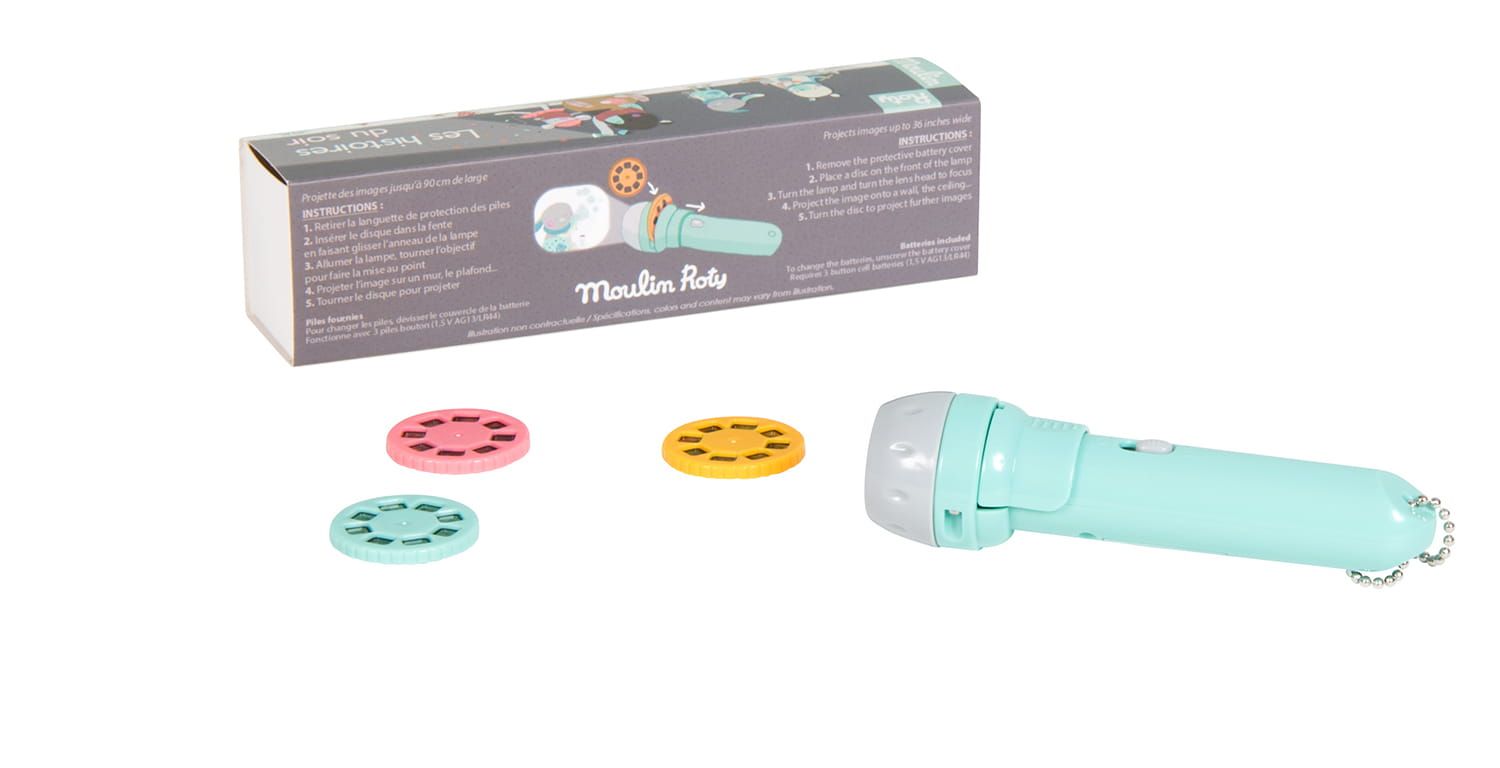 Zanurz się w trzech różnych światach, dzięki flagowemu produktowi Moulin Roty. Odkryj trzy ponadczasowe i klasyczne opowieści. Mała latarka projektor, do której wkładamy 3 różne filmiki, z których każdy opowiada inną historię. Do projekcji na ścianie lub suficie.