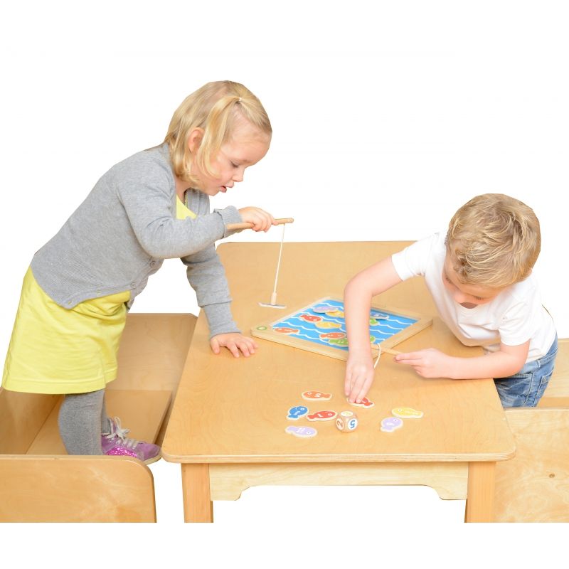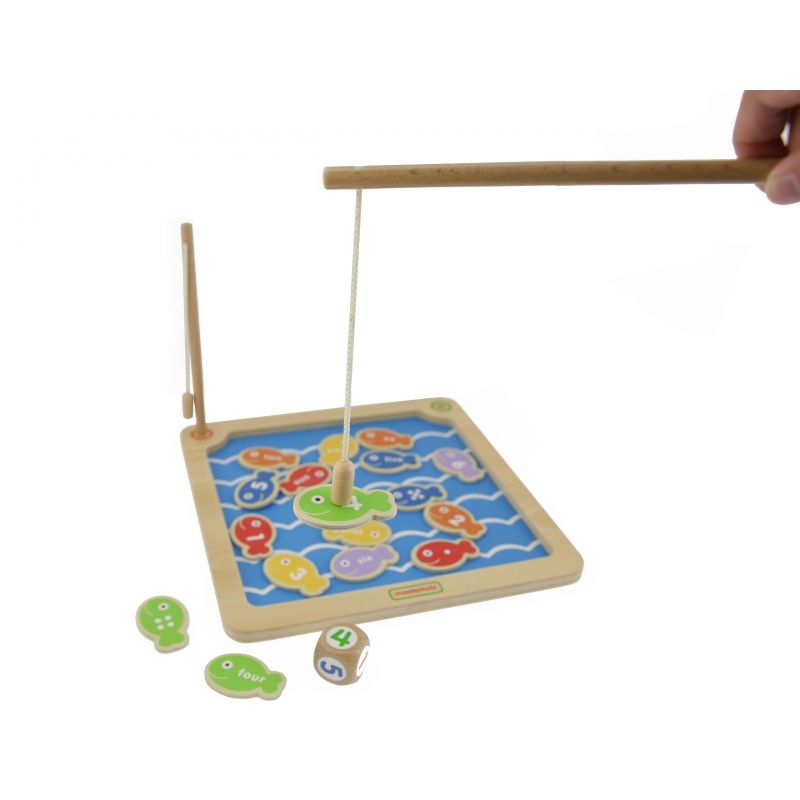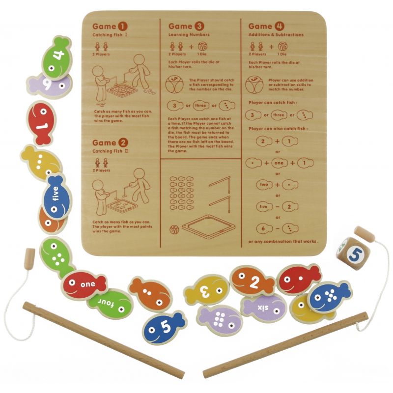 Dzięki zestawowi Łowienie rybek dziecko może poznać cyferki i nauczyć się liczenia do sześciu. Zestaw składa się z dwóch magnetycznych wędek, drewnianej tabliczki, kostki do gry oraz osiemnastu rybek z cyferkami, słowami lub kropkami na bokach. Zabawka została wykonana z drewna wysokiej jakości.