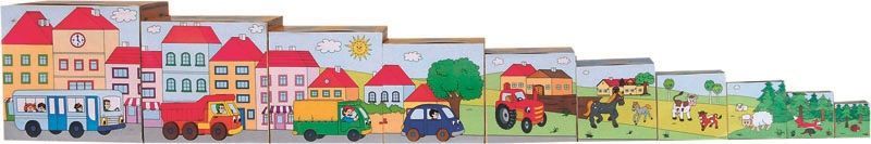 Kubeczki można układać na klika sposobów – można z nich ułożyć wieżę, domek lub obrazek przedstawiający miasto i wieś. Za pomocą klocków, dziecko może uczyć się cyferek od 1 do 10 – mają one nadrukowane cyfry. Klocki wykonano z drewna. Budowanie z klocków rozwija wyobraźnię oraz zdolności manualne.