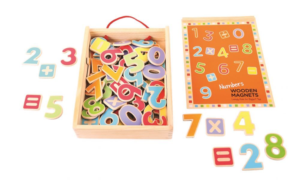 Kolorowe cyferki zostały wykonane z drewna. Są namagnesowane na całej powierzchni z tyłu, co zapewnia dużą przyczepność. W zestawie znajduje się aż 88 magnesów: 73 sztuki magnetycznych cyferek oraz 15 symboli matematycznych, umożliwiających układanie równań. Całość została zapakowana w poręczną drewnianą skrzyneczkę, dzięki czemu elementy nie zostaną pogubione, a dziecko będzie mogło zabierać zabawkę wszędzie ze sobą.
