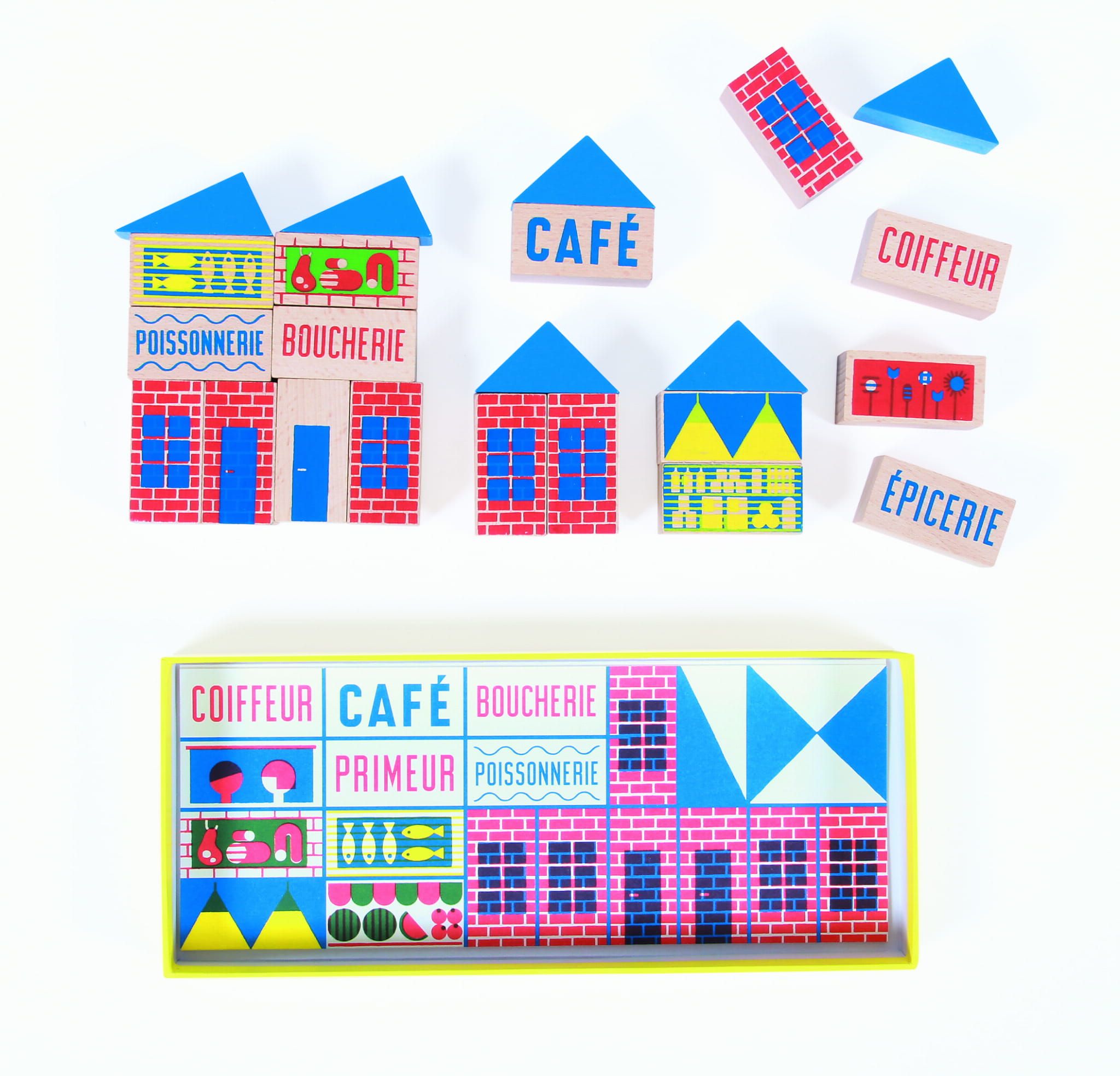 Zestaw drewnianych klocków składa się z 23 elementów wykonanych z buku. Przedstawiają fasady domów, znaki sklepowe, drzwi, okna… Ta gra konstrukcyjna rozwija umiejętności motoryczne i wyobraźnię dziecka, a także pojęcie przestrzeni. Zaprojektowany przez Aurélien Débat.