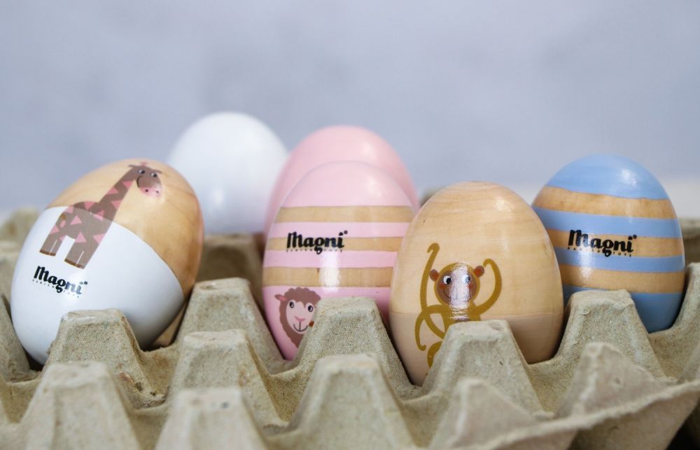 Marakas drewniany jajko – motyw Arki Noego Magni to prosty instrument, który może posłużyć jako grzechotka. Dźwięk, który wyda przy potrząsaniu zaintryguje malucha i będzie go zachęcał do ćwiczenia koordynacji wzrokowo-ruchowej. Starsze dzieci mogą za pomocą marakasów kształtować poczucie rytmu przygrywając na nich do swojej ulubionej piosenki. Marakasy mają kształt jajka, są niewielkie i lekkie.