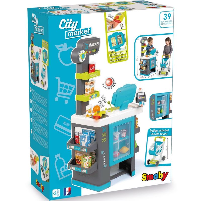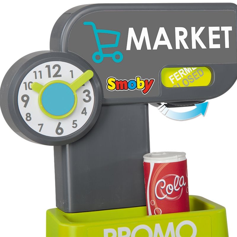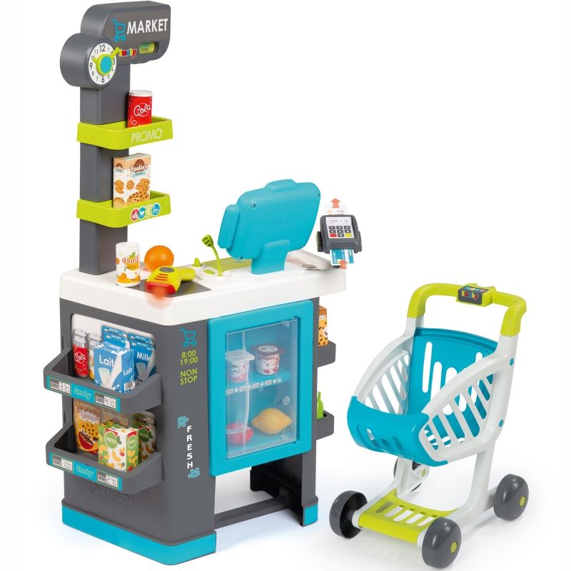 Zabawki francuskiej firmy Smoby cechuje bardzo wysoka jakość wykonania. Są wykonane z najwyższą starannością z trwałych materiałów i pomalowane bezpieczną dla dzieci farbą. Market został wyposażony w kasę z kalkulatorem, skaner, kasetkę, terminal z drukarką paragonów, lodówkę/chłodziarkę, wózek sklepowy oraz wiele innych akcesoriów. Wyjątkowa forma zabawki zapewni doskonałą rozrywkę maluchom!