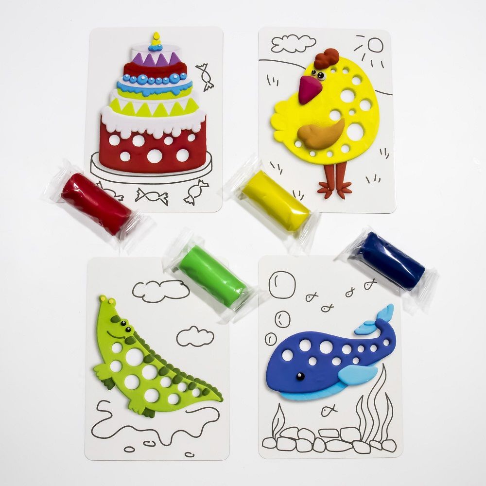 W zestawie znajdziemy 4 masy w różnym kolorze oraz 4 karty z zadaniami.