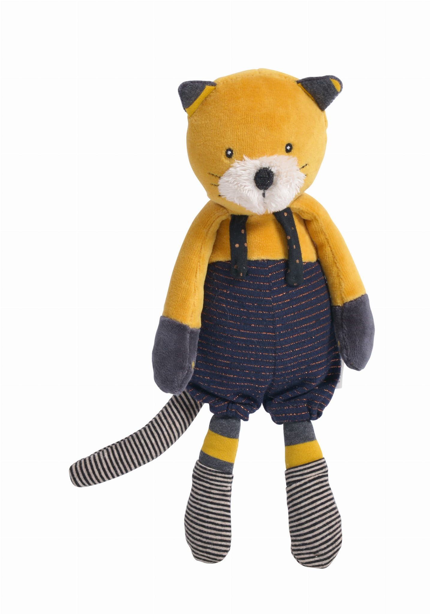 Oto kolekcja Moustaches od Moulin Roty: wesoły zespół muzyków! Ta pluszowa zabawka o długości 27 cm to kot Lulu w pasiastych ogrodniczkach i skarpetach. Tego aksamitnego kocura łatwo złapać za kończyny; będzie idealnym towarzyszem do zabawy i przytulania!