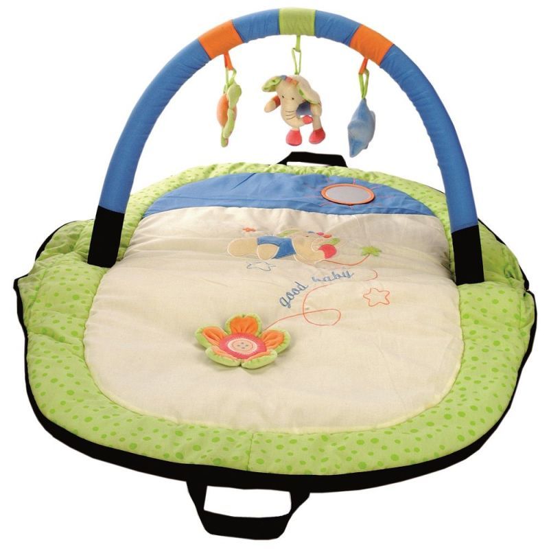 Mata zawiera elementy, które rozbudzają ciekawość i zachęcają malca do aktywności: kwiatek z płatkami, bezpieczne lusterko oraz zabawki z grzechotką na pałąku. Istnieje możliwość odpięcia zabawek i wymiany ich na inne.