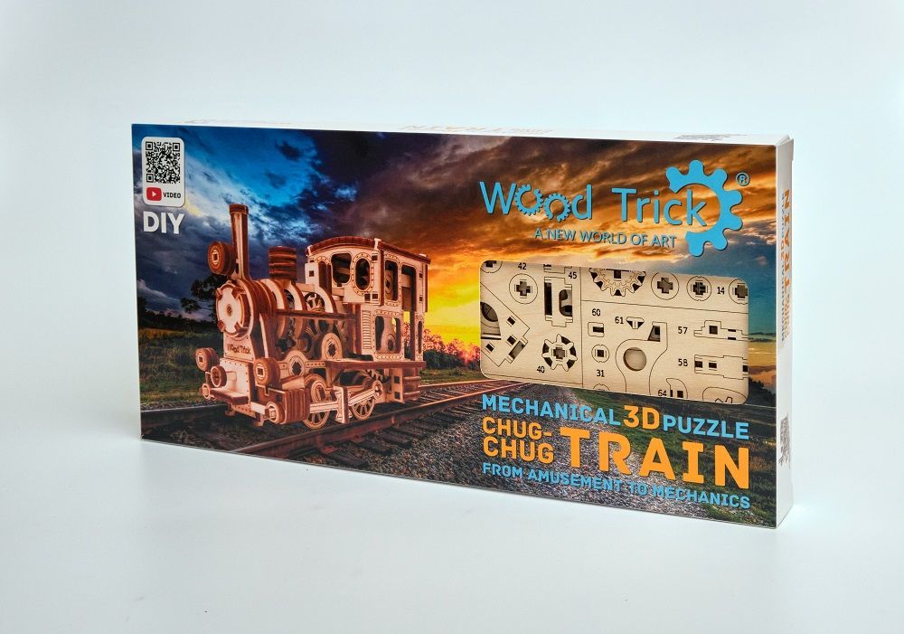 Mechaniczne puzzle 3D – Ciuchcia Chug-Chug Wood Trick to niezwykły zestaw puzzli mechanicznych, który zapewni długie godziny wciągającej i rozwijającej zabawy. Produkt ten spodoba się fanom tego typu rozrywki w każdym wieku. W zestawie znajduje się drewniany panel ze sklejki z naciętymi elementami do wypychania oraz obrazkowa instrukcja przedstawiająca jak złożyć model krok po kroku.