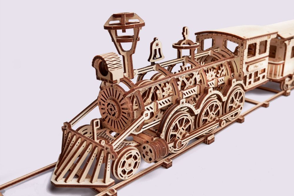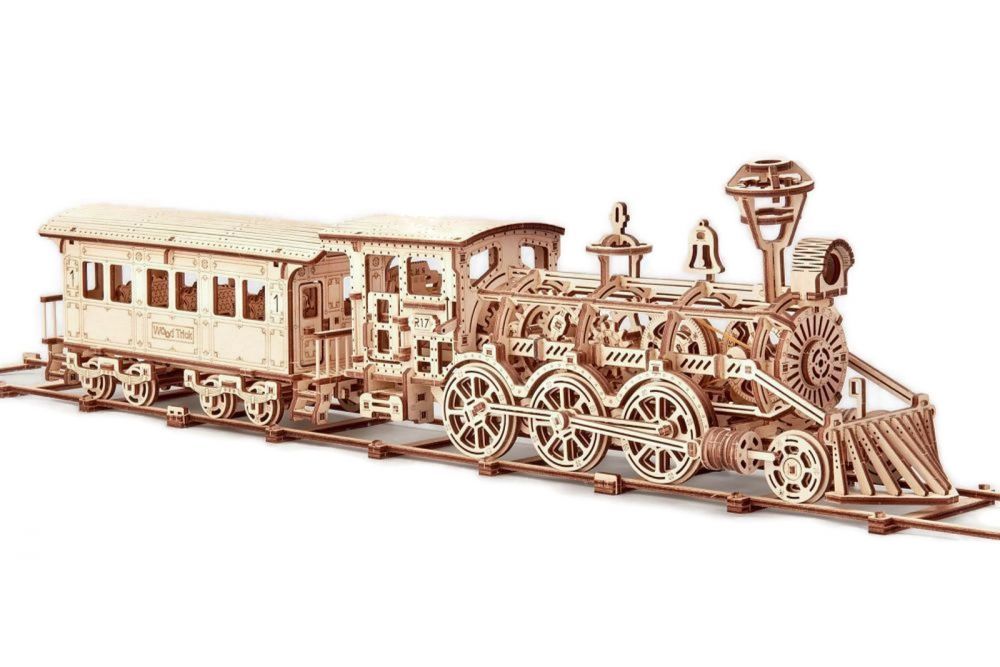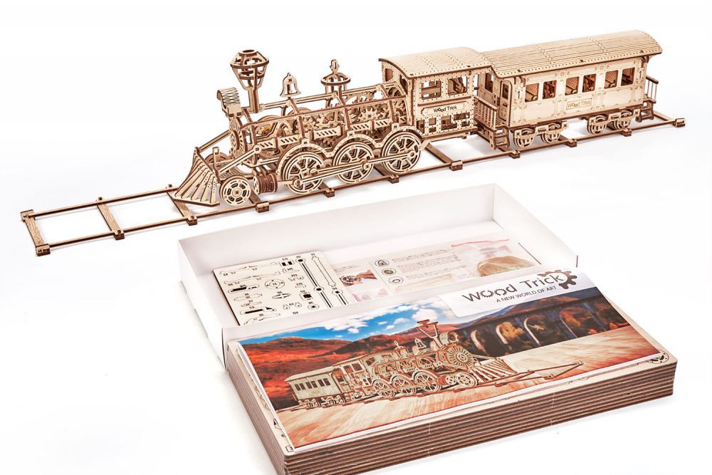 Mechaniczne puzzle 3D – duża lokomotywa R17 z wagonem i torami Wood Trick
