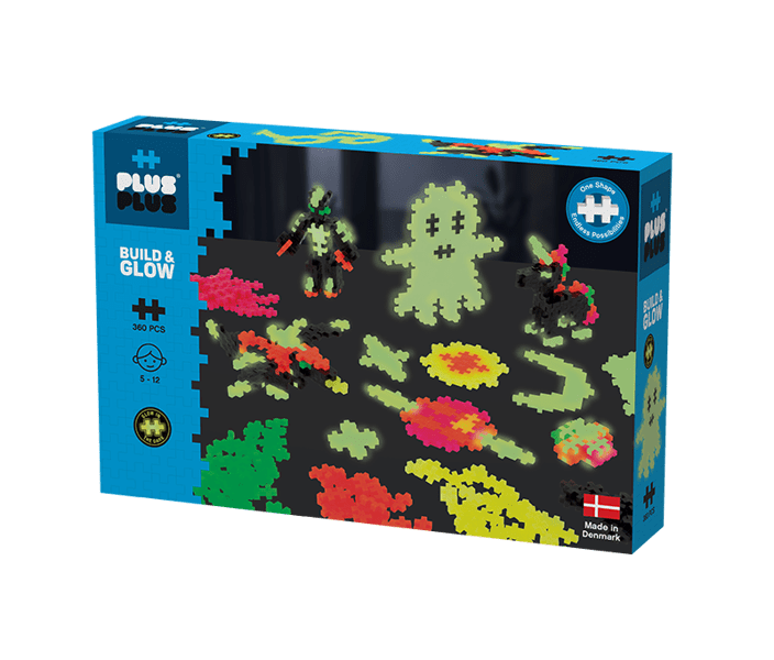 Cechy szczegółowe klocków Mini GLOW Basic- 360 szt. – świecące w ciemności Plus-Plus: