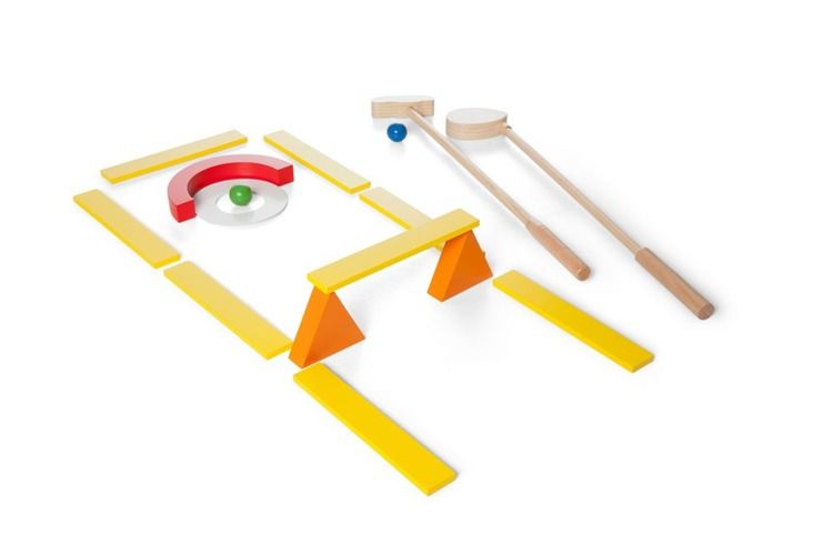 Zestaw do gry w minigolfa zapewni smykowi godziny wspaniałej zabawy! W pudełku mały golfista znajdzie 10 drewnianych klocków, 2 kije o długości 62 centymetrów, 2 piłeczki, dołek oraz 18 kart prezentujących możliwe sposoby ułożenia klocków. Po skończonej zabawie klocki i piłeczki można schować do dołączonego do zestawu bawełnianego worka, więc nie ma obawy, że elementy się pogubią.