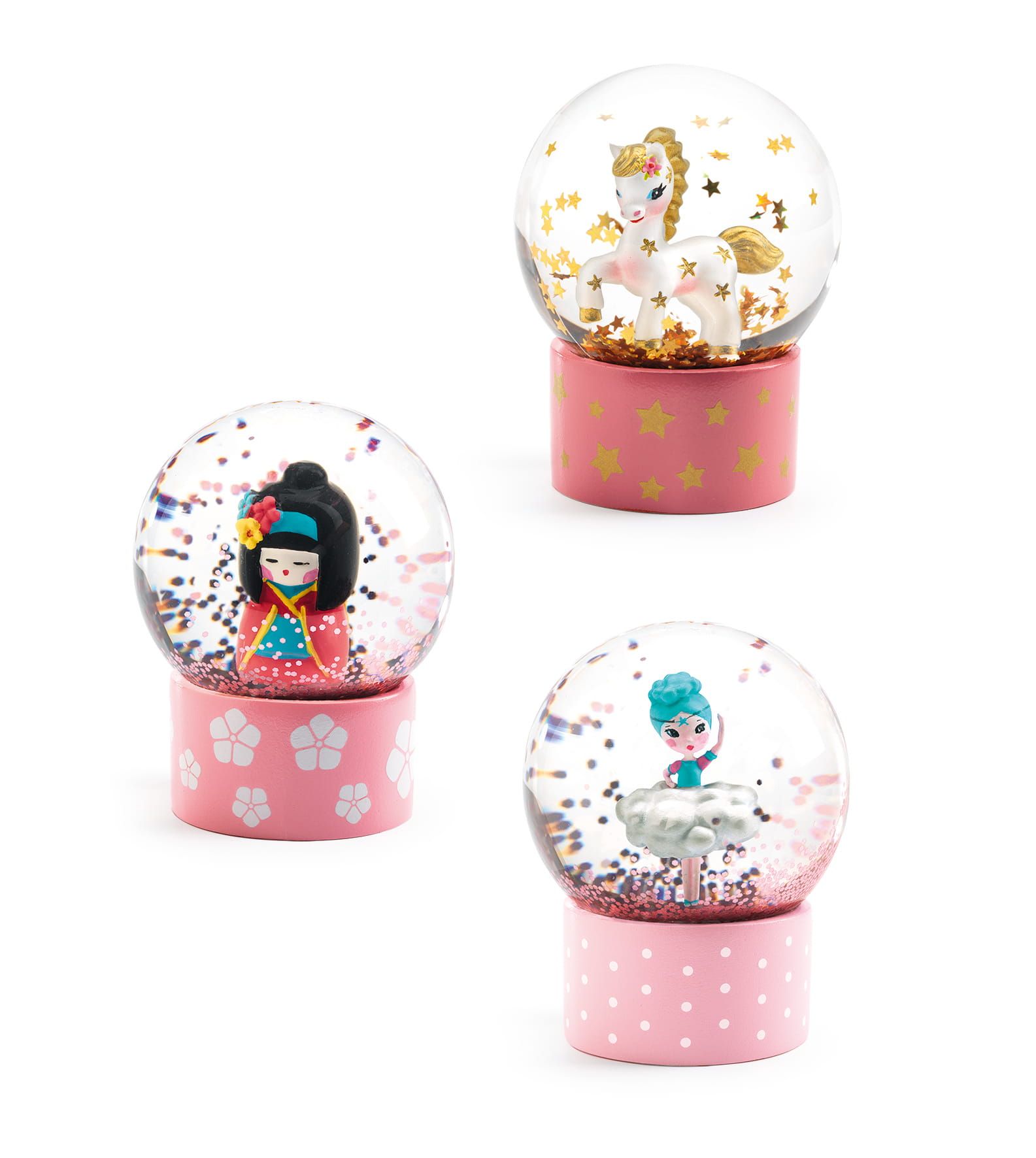 Minikule śnieżne Słodziaki to cudowna dekoracja pokoju, która zachwyci Twoją pociechę. Akcesoria składają się z różowej podstawki ozdobionej wzorami (kropkami, kwiatkami lub gwiazdkami), szklanej kuli oraz ślicznej figurki – w zestawie Słodziaki jest to balerina, kucyk i Japonka. Kule zostały wykonane z dużą dbałością o detale, dlatego pięknie się prezentują.