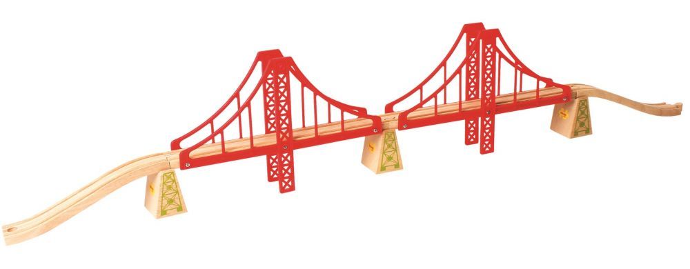 Most wiszący podwójny do kolejek drewnianych BigjigsRail to produkt, który urozmaici trasę dla pociągu i zachwyci każdego obserwatora oraz budowniczego! Most ten jest bardzo długi – cała konstrukcja ma ponad metr. Zestaw składa się z: dwóch przęseł mostu, trzech klocków podpierające konstrukcję oraz dwóch odcinków torów (podjazd i zjazd). Czerwone elementy wykonano z plastiku, reszta jest drewniana.