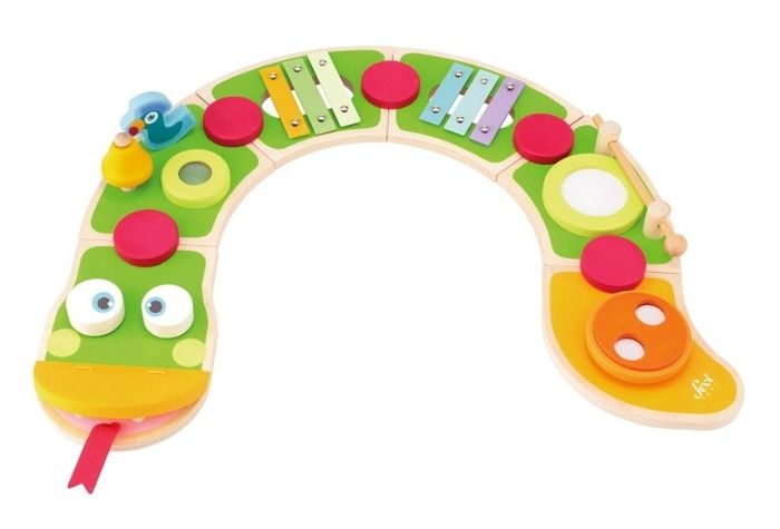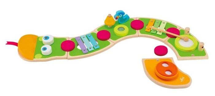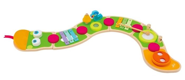 Multiaktywny wąż z instrumentami będzie doskonałym wstępem do świata muzyki. Wąż ma na sobie aż 8 różnych instrumentów, które z pewnością spodobają się każdemu maluchowi. Zabawkę wykonano z drewna, dzięki czemu całość jest trwała i solidna. Całość ma postać wzorowanego na postaciach z bajek pytona.