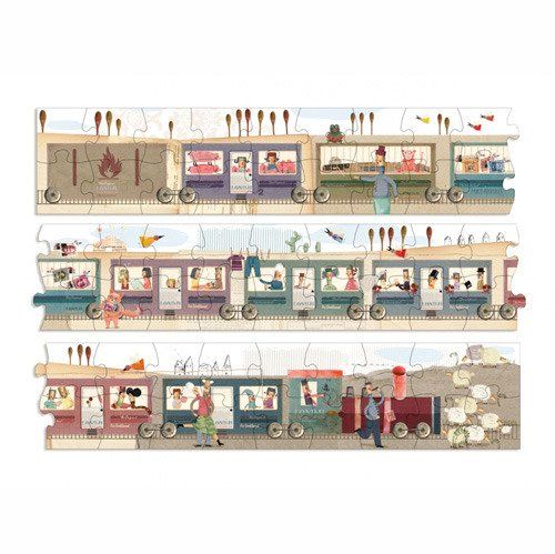 Puzzle dla dzieci przedstawiające pociąg składają się z 54 elementów, ich ułożenie stanowi fascynujące wyzwanie dla dziecka. Na oryginalną formę puzzli składa się to, że ułożony obrazek jest bardzo długi – ma aż 2 metry! Ilustracja została wykonana przez znanych grafików tworzących w unikalnym, stonowanym stylu. Cieszy oczy nie tylko dzieci, ale także dorosłych! Układanie puzzli stanowi doskonałe ćwiczenie koordynacji ręka – oko oraz trening cierpliwości i spostrzegawczości.
