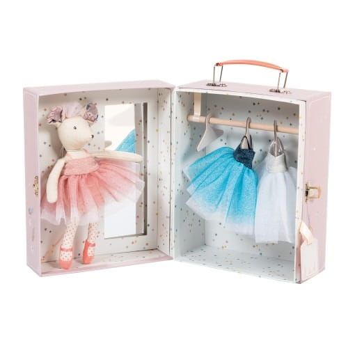 Myszka Ballerina podróżuje w swojej walizeczce-garderobie, w której znajdują się 3 wieszaki, bezpieczne lustro i 2 dodatkowe urocze sukienki baletnicy.