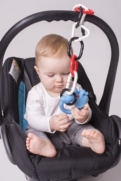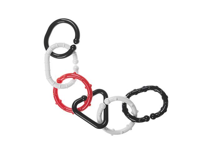 Ogniwa czarno-białe Tullo to produkt, który może posłużyć do wieszania zabawek przy łóżeczku lub wózku lub jako samodzielna zabawka. Dziecko może próbować łączyć poszczególne elementy ćwicząc przy tym umiejętność chwytania i manipulowania przedmiotami.