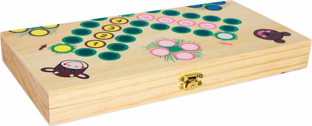 W zestawie znajduje się plansza, pionki oraz dwie kostki. Plansza jest jednocześnie pudełeczkiem zamykanym na zatrzask. Granie w planszówki to nie tylko doskonała zabawa, ale także nauka zachowań społecznych – dziecko obserwując dorosłych uczy się zarówno przegrywać, jak i wygrywać z klasą. W grę może grać od 2 do 4 osób.