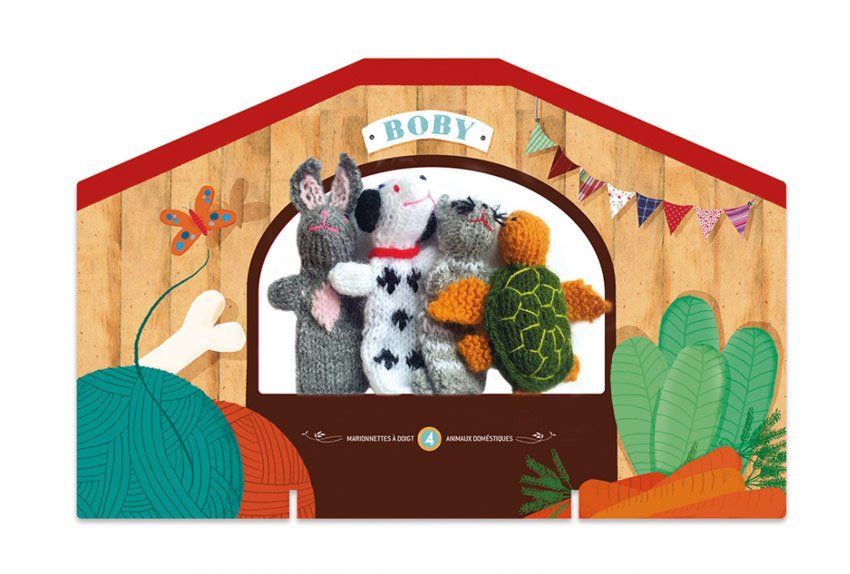 Zestaw zawiera mini scenę, która jest jednocześnie opakowaniem i cztery pacynki – są to domowe zwierzątka. Zrobione są one z wełny antyalergicznej, scenę wykonano z utwardzonej tektury.