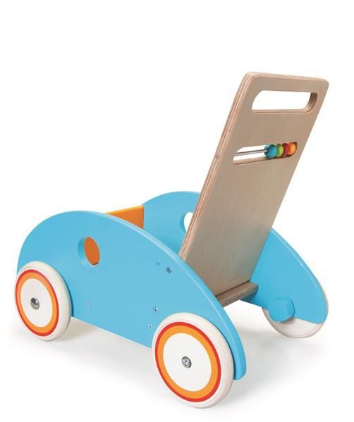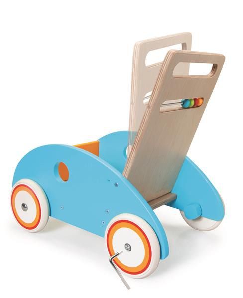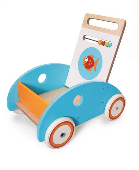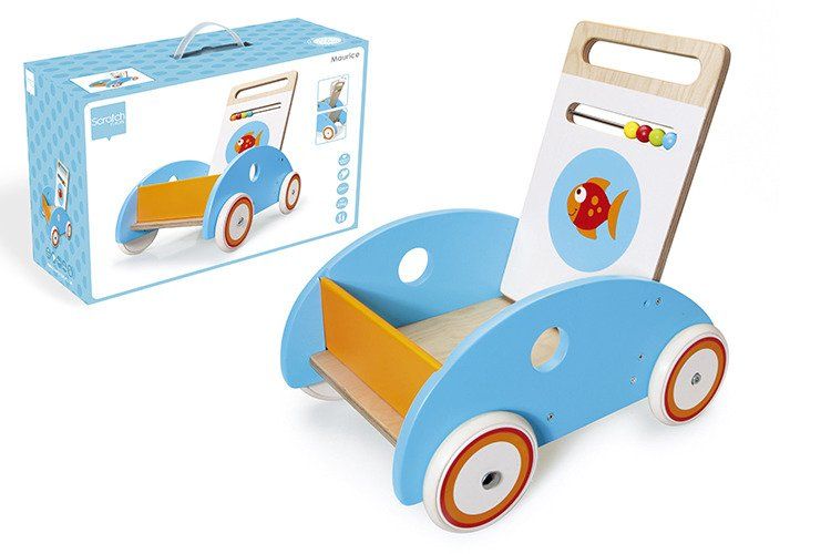 Pchacz Rybka to piękna, wykonana z dużą dbałością o szczegóły zabawka. Dzięki gumowym oponom koła nie pozostawiają śladów na podłodze, więc smyk może bawić się nią zarówno na zewnątrz, jak i w domu. Oparcie pchacza wyposażono w kolorowe kulki, które na pewno wzbudzą zainteresowanie dziecka. Wysokość uchwytu jest regulowana – można łatwo dopasować ją do wzrostu małego spacerowicza.