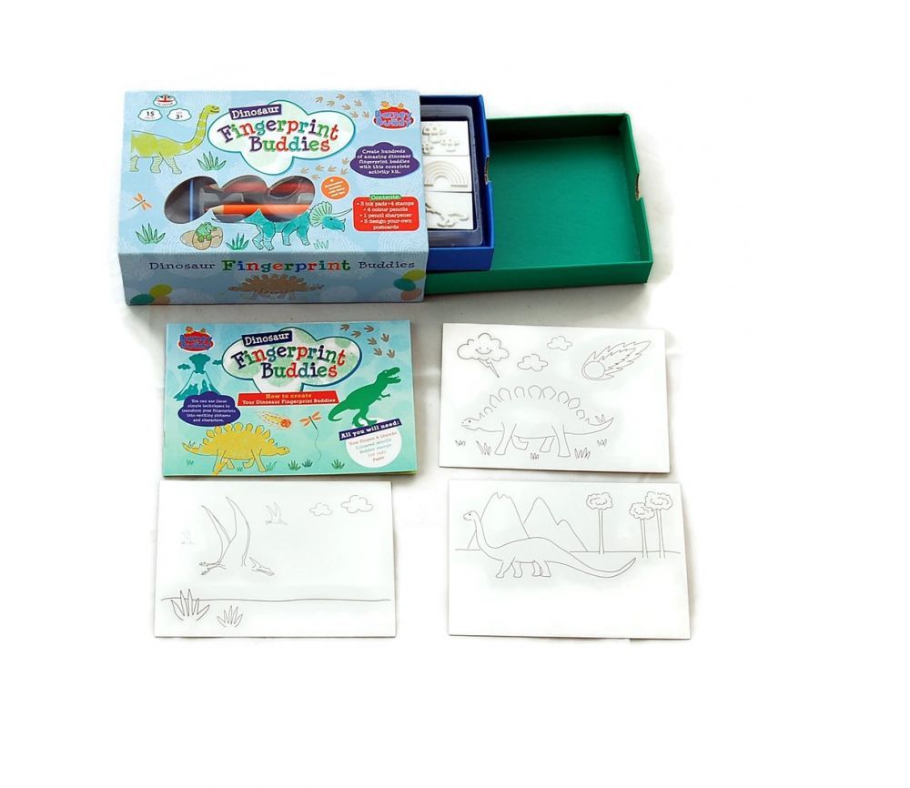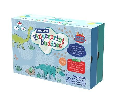 Pieczątki i tusze do malowania palcami Buddy & Barney to wszechstronny zestaw, który pozwala wykazać się kreatywnością oraz gwarantuje świetną zabawę! Produkt zachwyci każdego małego znawcę dinozaurów. W zestawie znajdują się 4 różne stempelki (z tyranozaurem, z jajami oraz wykluwającym się dinozaurem, z tęczą i z grzybkami), tusze w 3 kolorach (zielony, granatowy i czarny), 4 kredki, temperówka, książeczka z instrukcją obrazkową, 3 kartki pocztowe do pokolorowania i ozdobienia z nadrukowanymi sylwetkami dinozaurów.
