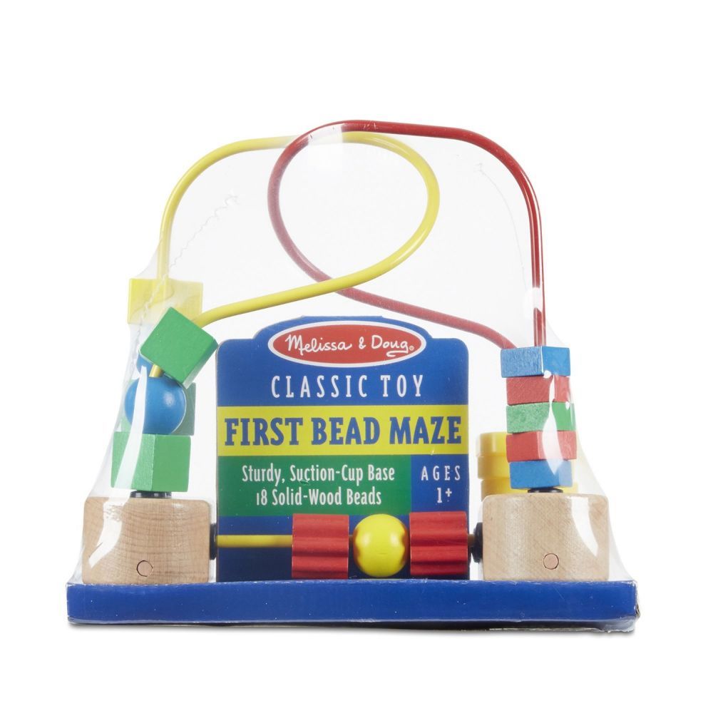 Pierwsza przeplatanka Melissa & Doug to przyrząd, który gwarantuje zarówno świetną zabawę, jak i ćwiczenie zręczności małych dłoni. Zabawka składa się z dwóch powyginanych drucików na górze oraz dwóch prostych na dole. Na drucikach umieszczono kolorowe koraliki w różnych kształtach. Na dole, przy podstawie, umieszczono przyssawki, dzięki którym zabawka nie spadnie.