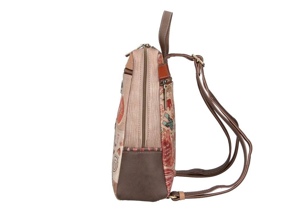 Jego oryginalny design łączy się z górną częścią w brązowej tonacji. Posiada kieszeń z tyłu dla większego komfortu. Otwiera się u góry na suwak i ma obszerne wnętrze z podszewką i kieszeniami. Dopełnieniem są regulowane szelki oraz detale z ozdobnymi, błyszczącymi aplikacjami, naszywką, nadrukowaną podszewką i oryginalnym brelokiem do kluczy.