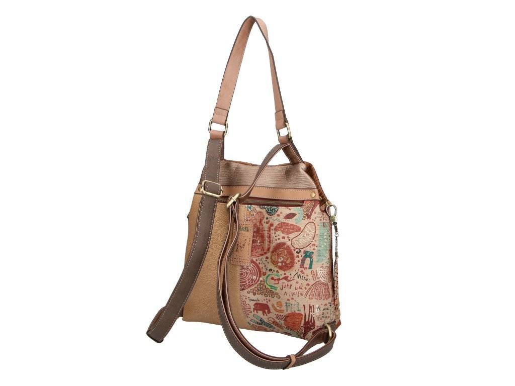 Jego oryginalny design łączy się z górną częścią w brązowej tonacji. Posiada kieszeń z tyłu dla większego komfortu. Otwiera się u góry na suwak i ma obszerne wnętrze z podszewką i kieszeniami. Dopełnieniem jest długie ucho oraz detale z ozdobnymi, błyszczącymi aplikacjami, naszywką, nadrukowaną podszewką i oryginalnym brelokiem do kluczy.