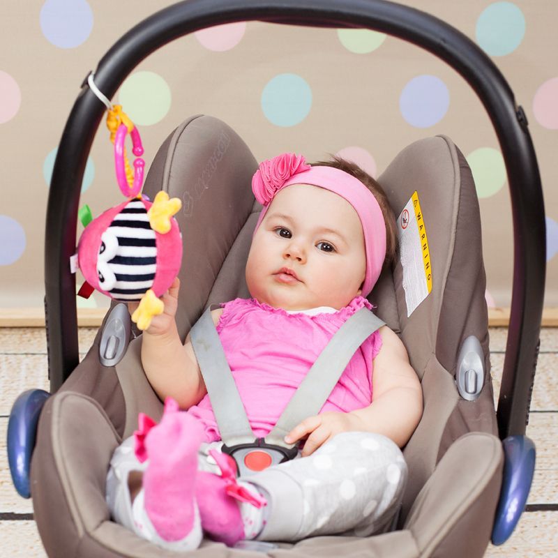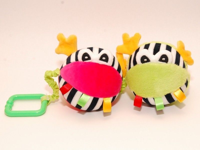 Piłeczka została wykonana z bardzo miękkich i przyjemnych materiałów. Zabawka dodatkowo grzechocze i szeleści, co stanowi dodatkową atrakcję. Posiada elastyczny sznureczek, który można bez końca rozciągać, a na jego końcu znajduje się uchwyt, który pozwala przymocować zabawkę do wózka i zabierać na spacery. Całość utrzymana w kontrastowej kolorystyce. Doskonale nadaje się na prezent.