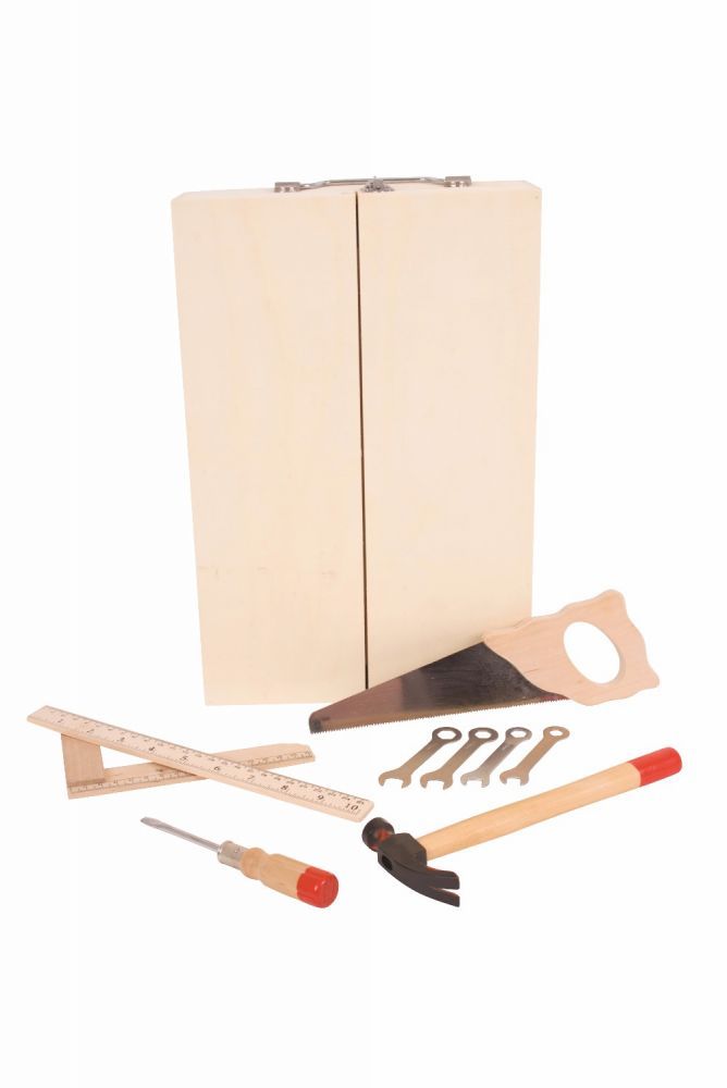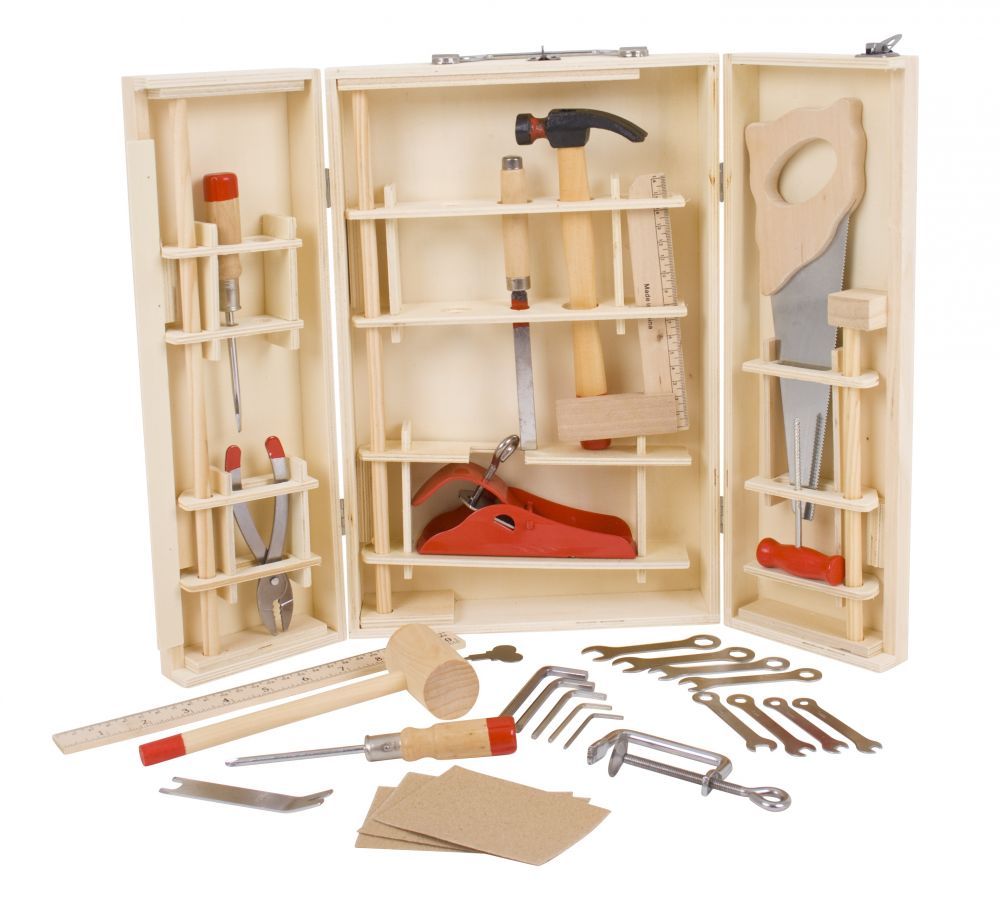 Za pomocą narzędzi, znajdujących się w zestawie, można naprawdę majsterkować! W skład zestawu wchodzą: 2 młotki (zwykły drewniany i ciesielski z metalową końcówką), 2 śrubokręty (płaski i krzyżakowy), metalowe kombinerki, 2 drewniane miarki, pilnik, metalowa piła z drewnianym uchwytem, strug stolarski, 4 klucze imbusowe, 8 kluczy francuskich (od 5 do 12 mm), metalowe narzędzie do wyciągania gwoździ, kluczyk z ostrą końcówką do małych elementów, 3 arkusze papieru ściernego, drewniana kostka szlifierska, metalowy ścisk stolarski oraz narzędzie przypominające korkociąg do wykonywania otworów.