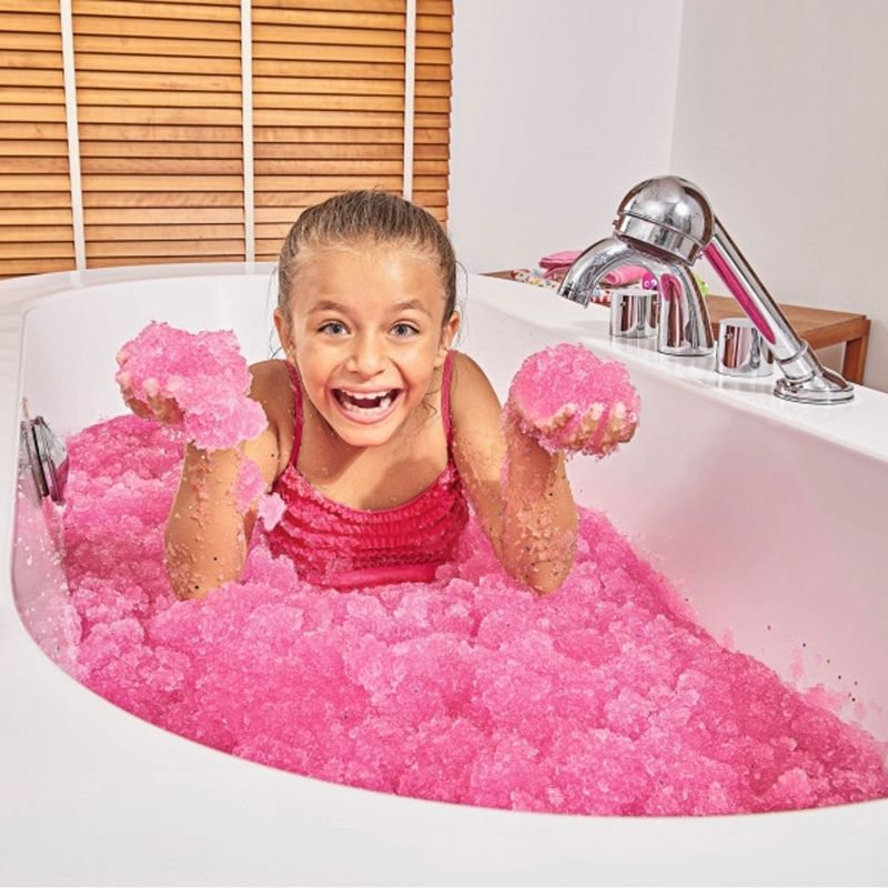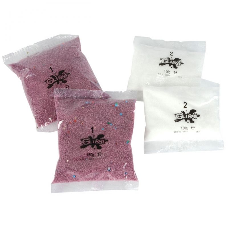 Żelkowa masa Glibbi Glitter wywoła uśmiech na twarzy każdego malucha! Zestaw zawiera dwie torebki proszku – każda jest w stanie zamienić w masę 30 litrów wody. Wystarczy wymieszać proszek z cieczą i poczekać 5–10 minut! Aby rozpuścić masę po skończonej zabawie, należy wsypać biały proszek, wymieszać go z Glibbi, a następnie poczekać, aż masa stanie się płynna. Substancja nie zatyka odpływów. Produkt jest w pełni bezpieczny – nie zawiera składników drażniących, sztucznych substancji zapachowych ani konserwantów.