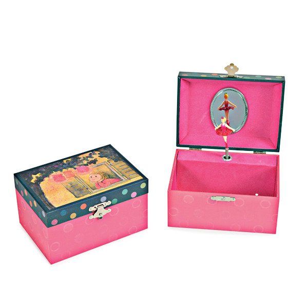 Pozytywka – szkatułka pozwoli każdej małej dziewczynce przechowywać drobne skarby. Mogą to być gumki, spinki, biżuteria, ale też zdjęcia najbliższych. Szkatułka wykonana jest z utwardzonej tektury oraz z mdf – płyty drzewnej. W środku została wyłożona miękkim materiałem. Po otworzeniu i nakręceniu drobna baletnica obraca się, przeglądając w lusterku, a pozytywka gra melodię. Całość zapakowana jest w pudełko z okienkiem, przez co stanowi doskonały pomysł na prezent!