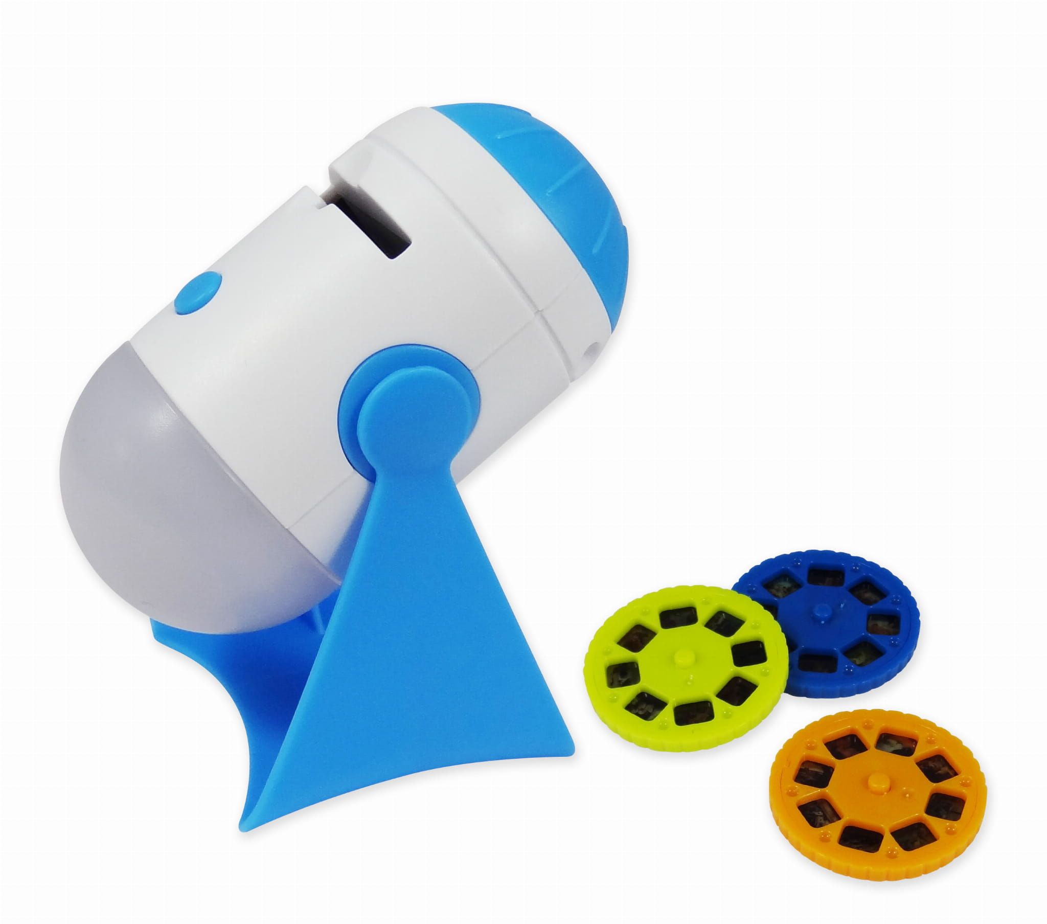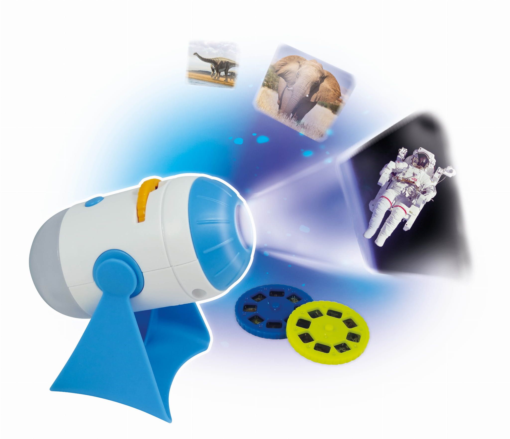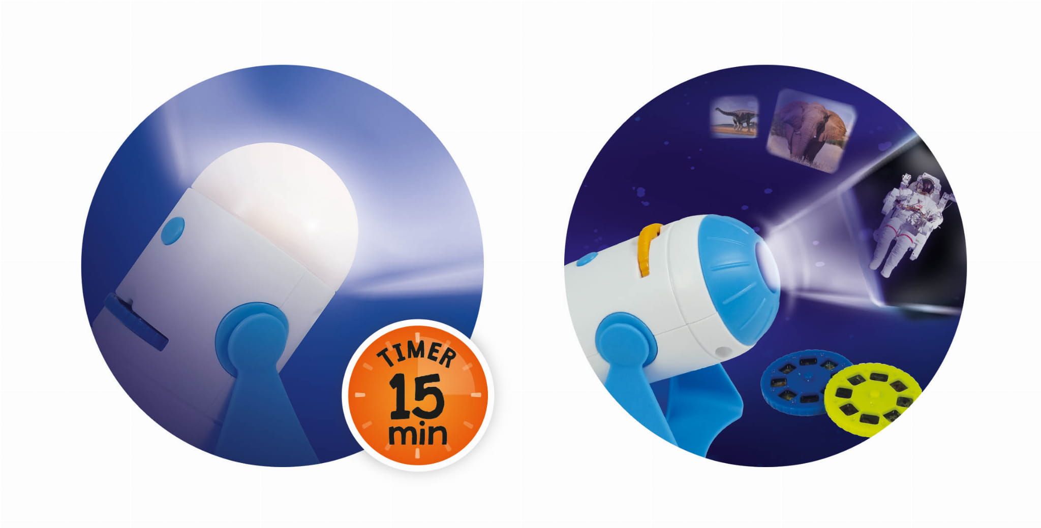 Projektor dwustronny 2w1. Z jednej strony projektor ze zdjęciami z kosmosu, zwierzętami i dinozaurami. Z drugiej strony lampka nocna LED-owa z timerem 15 min.