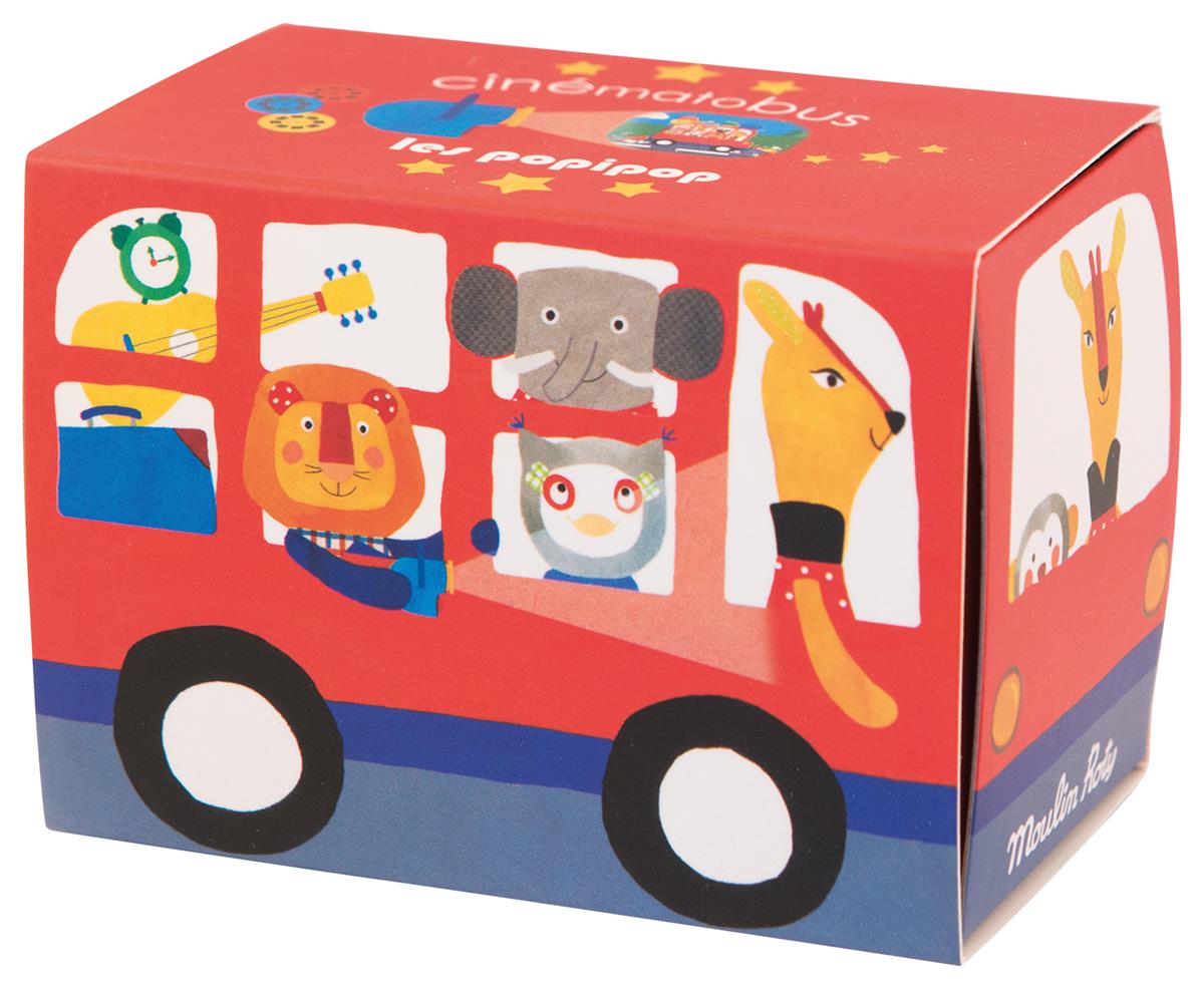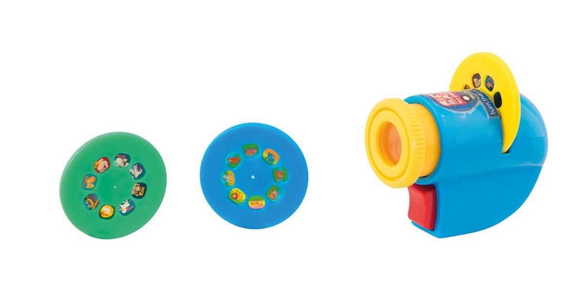 Projektor historyjek w kształcie mini kamery z kolekcji Les Popipop francuskiej firmy Moulin Roty. Po włożeniu krążka z obrazkami do specjalnego otworu w rzutniku można wyświetlać historyjki obrazkowe np. na ścianie. W zestawie znajdują się 3 krążki z 3 rożnymi historyjkami do wyświetlania (po 8 slajdów każdy). Ostrość ustawiamy, kręcąc pokrętłem przy soczewce.