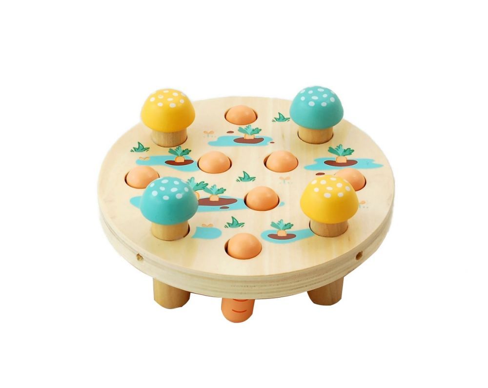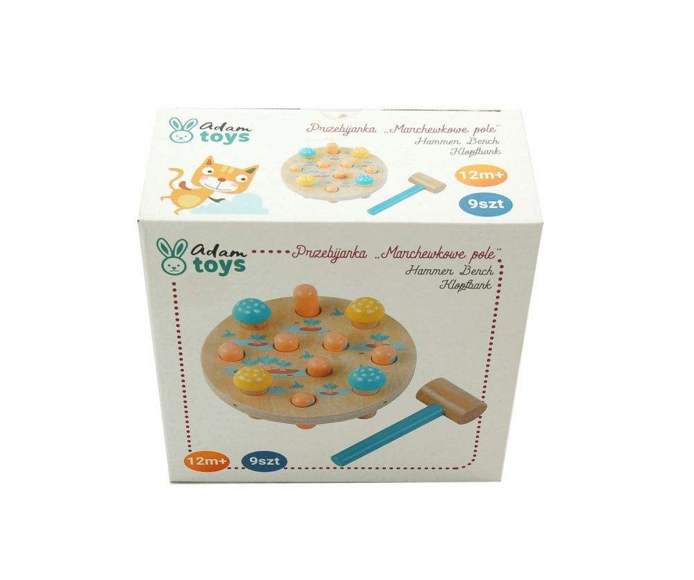 Zestaw składa się z podstawy z otworami, w których umieszczono 7 marchewek oraz młotka. Zadaniem dziecka jest uderzanie młotkiem w marchewki tak, aby „wbić” je w podstawę. Kiedy uda się już wbić wszystkie marchewki, można je wypchnąć i bawić się na nowo! Całość wykonano z drewna, produkt cechuje solidne wykonanie.
