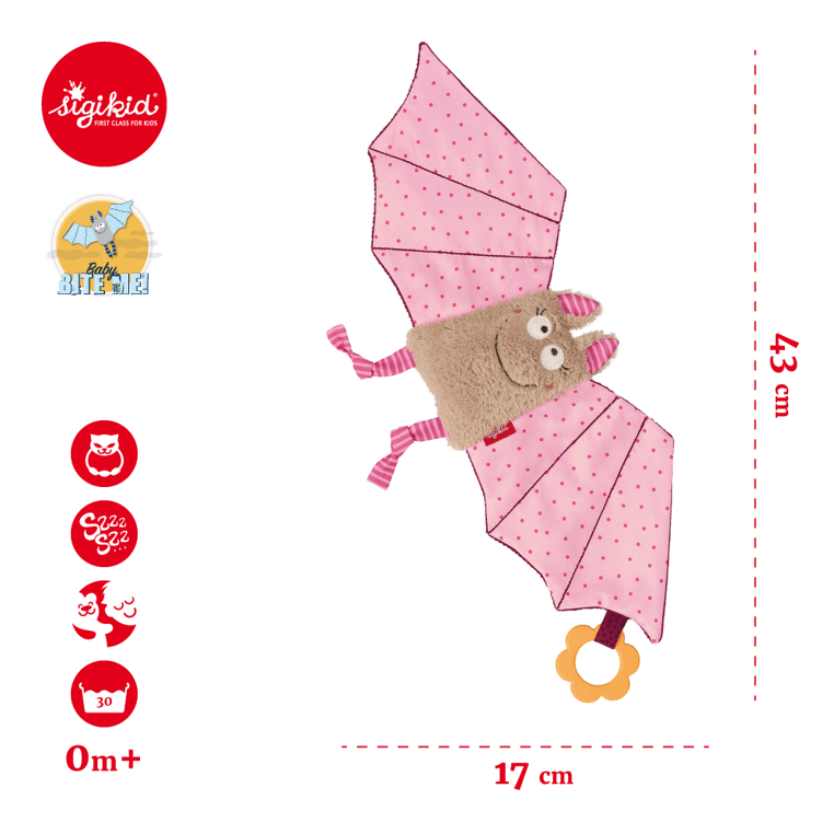 Różowy nietoperz może pełnić wiele funkcji. Tulenie mięciutkiej zabawki uspokaja maluszka, zapewnia mu poczucie bezpieczeństwa i pomaga w zasypianiu. Wielkość nietoperza jest dobrana tak, by pasował do małych rączek, dzięki czemu szkrab może trenować chwytanie. Kiedy malec zacznie ząbkować, dołączony do przytulanki gryzaczek z pewnością przyniesie mu ulgę. Warto również wspomnieć, że skrzydła nietoperza szeleszczą podczas dotykania, co pobudza zmysł słuchu dziecka.