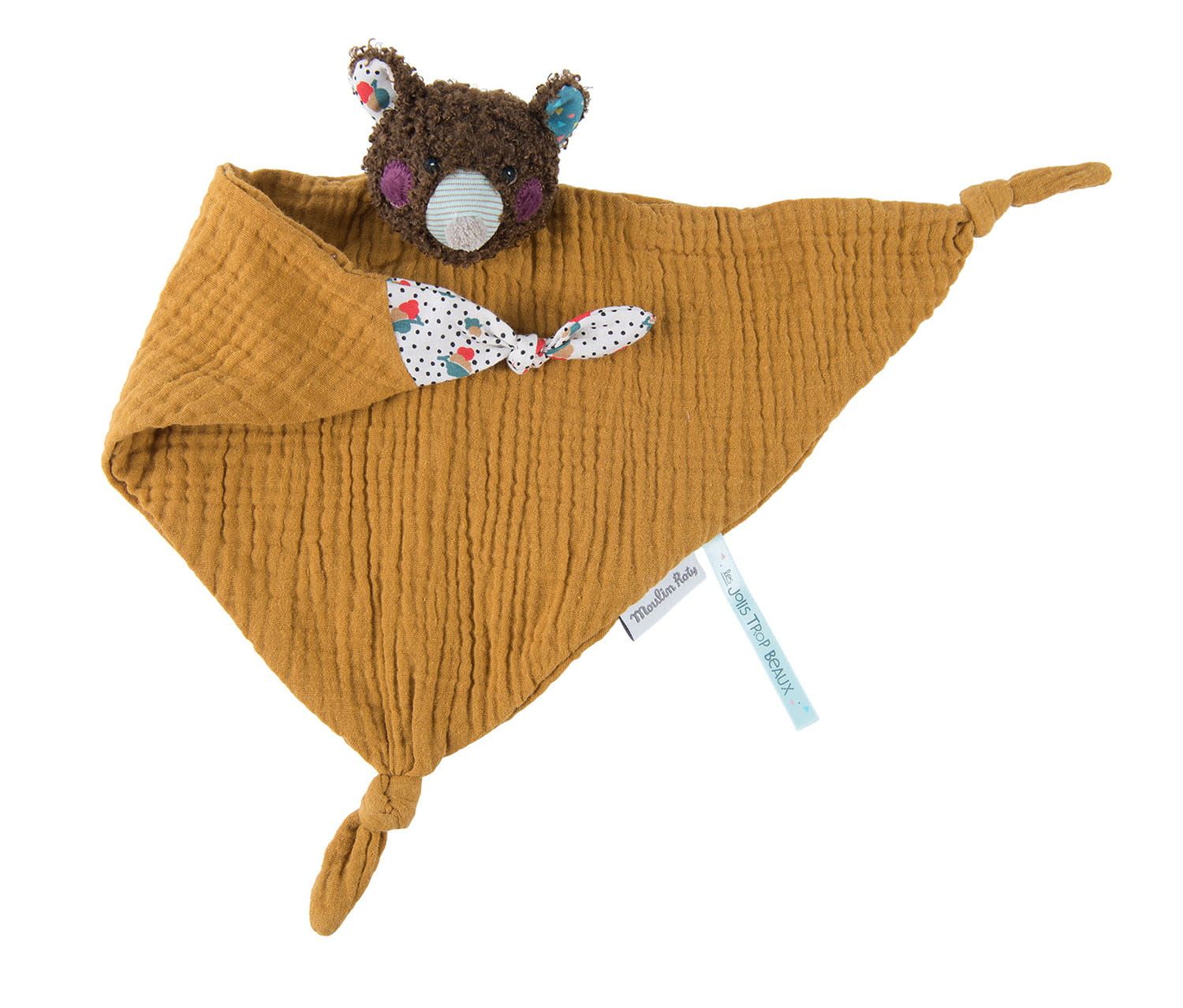 Oto kuzyni Jolis Pas Beaux. Przytulanka z uroczym niedźwiedziem wykonana jest z bawełnianego muślinu. Uroczy prezent dla noworodka.