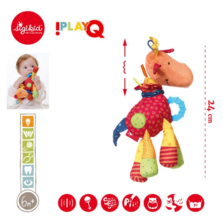 Zabawka dostarcza dziecku wielu bodźców, które korzystnie wpływają na jego rozwój. Podczas zabawy maluch może używać wszystkich zmysłów naraz! Żyrafa posiada piszczałkę, która z pewnością zaciekawi malca i zachęci go do odkrywania właściwości innych materiałów.