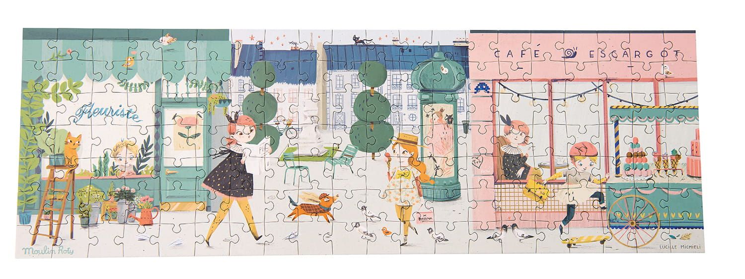 Puzzle Paryska ulica składają się ze 140 elementów, są zapakowane w owalne pudełko z ilustracjami Lucille Michieli. Przedstawiają paryskie postacie w mieście: na lodach, w kawiarni i w kwiaciarni.