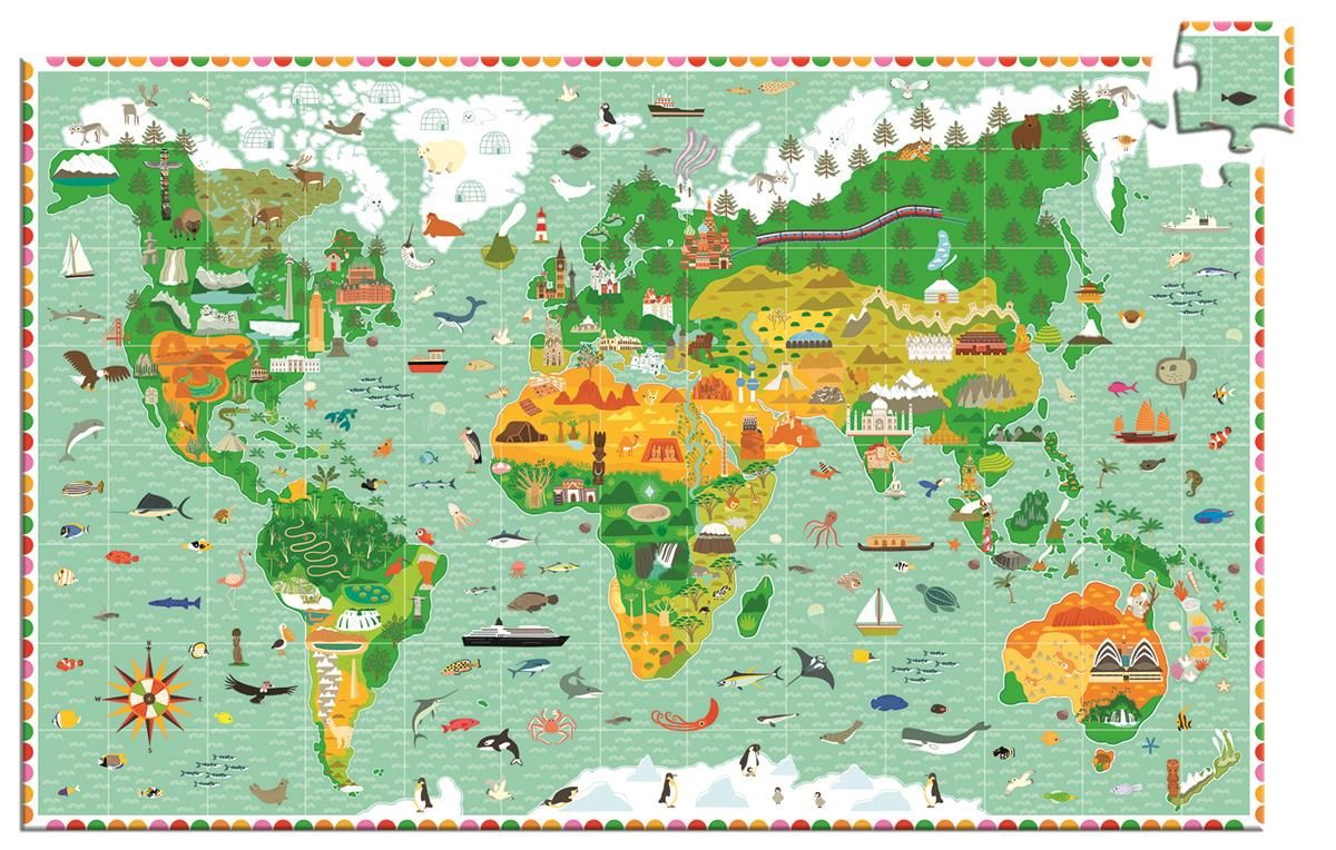 Jeśli Twój smyk uwielbia dowiadywać się nowych rzeczy, puzzle Budowle świata na pewno przypadną mu do gustu! Opakowanie zawiera 200 elementów, które po ułożeniu tworzą kolorowy obrazek przedstawiający mapę świata z charakterystycznymi dla danego regionu budowlami oraz zwierzętami. Do zestawu dołączono książeczkę w 6 wersjach językowych.