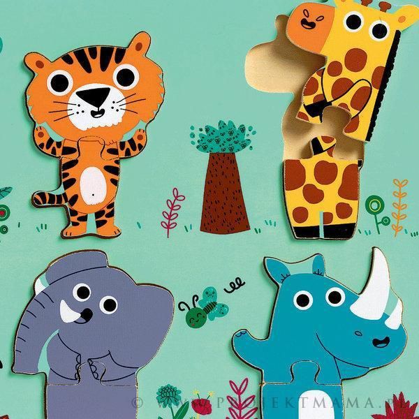 Wspaniałe puzzle dwuelementowe Dżungla rozbudzą wyobraźnię szkraba, a ponadto nauczą go rozpoznawania kształtów. Zadaniem dziecka jest ułożenie czterech postaci zwierzątek – słonia, żyrafy, nosorożca i tygrysa. Żywe kolory oraz miły dla oka design sprawią, że zabawka na pewno przypadnie malcowi do gustu.