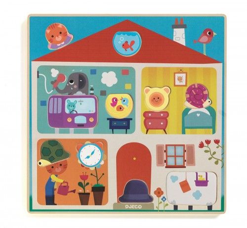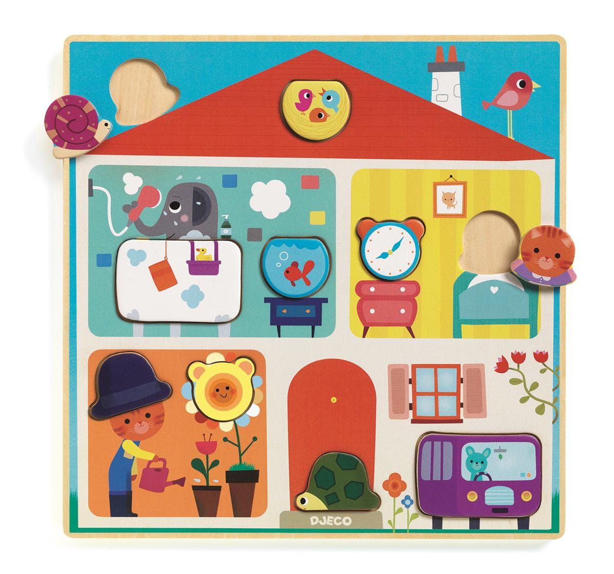 Układanka Zamiana miejsc przypadnie do gustu każdemu małemu odkrywcy. Brzdąc z zapałem zabierze się do odkrywania tajemnic niezwykłego domku. Czy przed drzwiami leży kapelusz, a może pełznie ślimak? Co podlewa Pan Kot? Gdzie znajduje się ptasie gniazdo? Dopasowując elementy do miejsc na planszy, smyk uczy się logicznie myśleć, ćwiczy spostrzegawczość, a także rozwija sprawność manualną. Zabawkę wykonała znana i ceniona francuska firma Djeco.