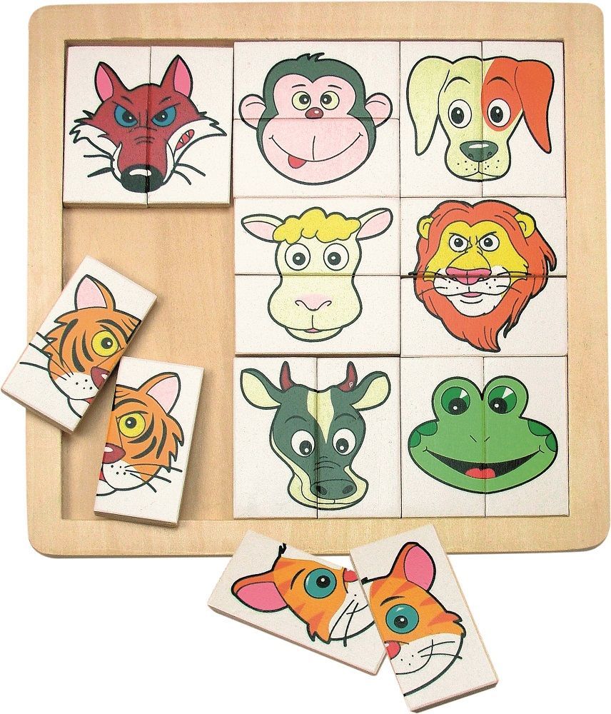 Puzzle głowy zwierząt Woody zapewnią doskonałą zabawę Twojemu maluchowi. Składają się ona z podstawy oraz 18 elementów. Z tych elementów można ułożyć portrety 9 zwierzaków – każdy portret składa się z dwóch części, niektóre są podzielone w pionie, a inne w poziomie. Zwierzaki można układać w drewnianej ramce lub poza nią.