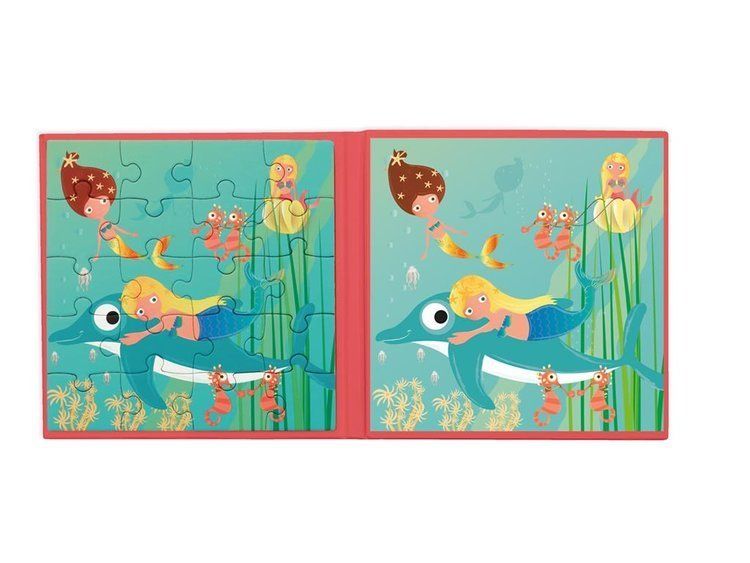 Puzzle magnetyczne – książka podróżna Syrenki 2 obrazki 40 elem. Scratch to doskonała układanka dla najmłodszych. Z pewnością spodoba się wszystkim pasjonatom podwodnego świata! Układanka składa się z magnetycznej podstawy w formie książeczki oraz 40 puzzli. Do ułożenia są 2 obrazki – każdy z nich składa się z 20 elementów. Podczas układania dziecko może wzorować się na gotowym obrazku – wzór znajduje się w książeczce.