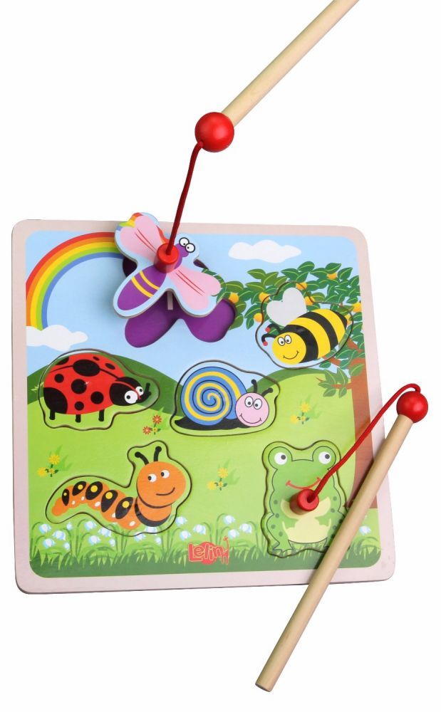 Puzzle Małe stworzonka to wspaniały pomysł na upominek dla malucha! Zabawa polega na podnoszeniu puzzli za pomocą wędki z magnesem, a następnie umieszczaniu ich z powrotem w odpowiednim miejscu. Puzzle przedstawiają zwierzątka, które można spotkać w ogrodzie: biedronkę, pszczółkę, ważkę, ślimaka, dżdżownicę i żabkę.