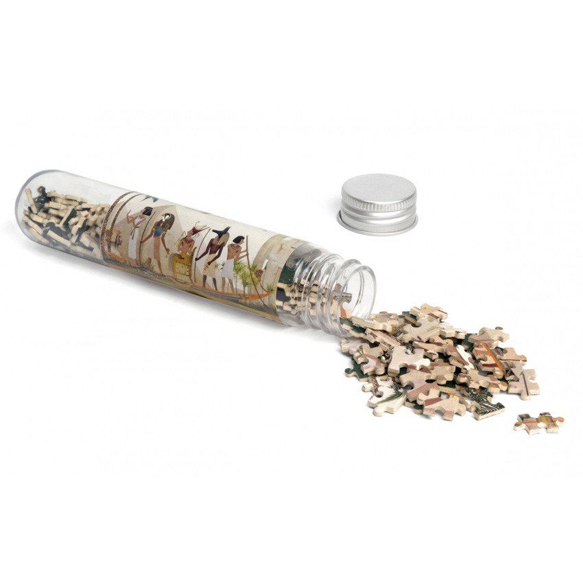 Puzzle mikro w menzurce Starożytny Egipt znajdują się w małym plastikowym i zakręcanym opakowaniu, które można wszędzie ze sobą zabrać. Układanka składa się ze 150 elementów i jest dość wymagająca ze względu na swój wzór. Grafika przedstawia charakterystyczne dla starożytnego Egiptu elementy, typu piramidy czy wizerunki bóstw. Kolorystyka jest stonowana i przyjemna dla oka.