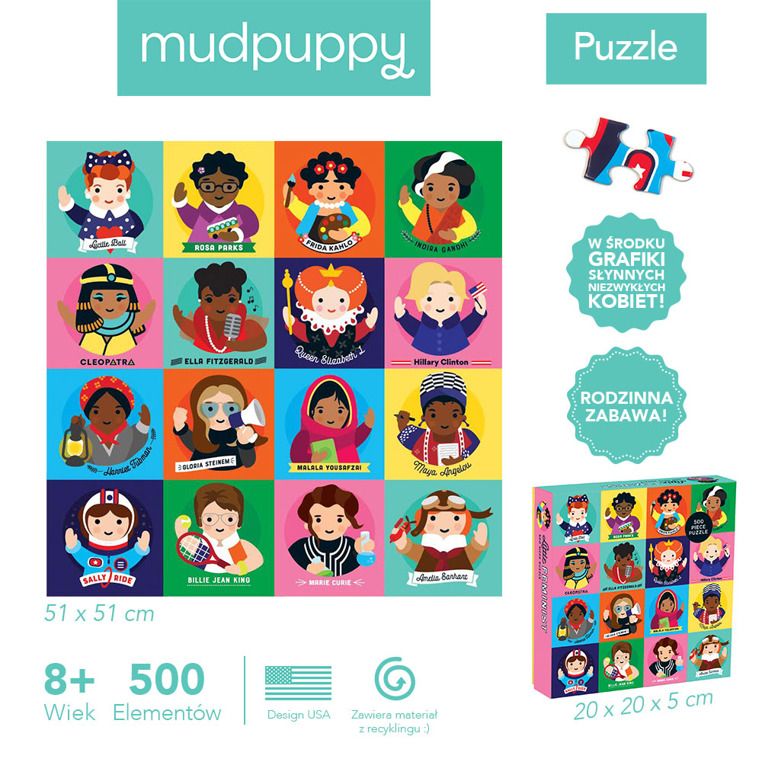 Amerykańska firma Mudpuppy dba, by jej zabawki dostarczały dzieciom przeżyć estetycznych i wyróżniały się niepowtarzalnym designem. Aby to osiągnąć, marka współpracuje ze współczesnymi artystami – autorką unikalnych portretów kobiet jest filipińska artystka, Lydia Ortiz. Wszystkie produkty Mudpuppy są pakowane w estetyczne pudełka, dzięki czemu idealnie nadają się na prezent.